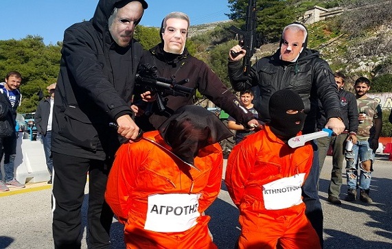 Έναν ιδιαίτερο τρόπο διάλεξαν οι αγρότες της Αιτωλοακαρνανίας για να αναδείξουν το αγροτικό πρόβλημα.Τσίπρας,Αποστόλου και Κατρούγκαλος ως τζιχαντιστές αποκεφαλίζουν αγρότες και κτηνοτρόφους!Αν μη τι άλλο ένας ευφυής τρόπος για να καταγγείλουν το νομοσχέδιο έκτρωμα του ασφαλιστικού.Μέγας βραχνάς αποδεικνύεται για την κυβέρνηση του ΣΥ.ΡΙΖ.Α. το ασφαλιστικό και η φορολογία του κλάδου των αγροτών.Με ''μπαλώματα'' προσπαθούν στην κυβέρνηση να αποφύγουν τους αγρότες,οι οποίοι θα κάνουν πίσω μόνο με την απόσυρση του νομοσχεδίου.Ένα νομοσχέδιο επαχθές για τον πιό παραγωγικό κλάδο της χώρας.Συνεχής ενημέρωση από το μπλόκο των αγροτών στο Κεφαλόβρυσο..